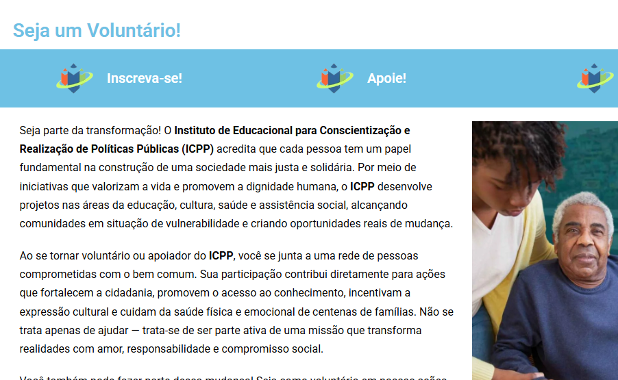 O Instituto Educacional para Conscientização e Realização de Políticas Públicas (ICPP) acaba de lançar seu novo site institucional, com um visual mais moderno, navegação simplificada e compatibilidade total com dispositivos móveis. A nova plataforma foi desenvolvida para refletir a identidade do Instituto e valorizar ainda mais os projetos sociais realizados nas áreas de educação, cultura, saúde e assistência social.